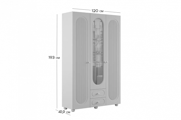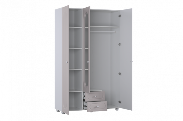 Шкаф оснащён тремя распашными дверями: две крайние двери выполнены из МДФ, а средняя дверь дополнена зеркалом, которое визуально расширяет пространство и делает комнату светлее. В нижней части предусмотрены два выкатных ящика, подходящих для хранения белья, аксессуаров или повседневных вещей.